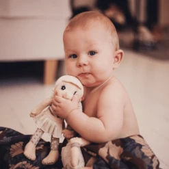 Fluweelzacht en met lange mouwen en benen voor het gemakkelijk vastpakken van de hand van de baby.