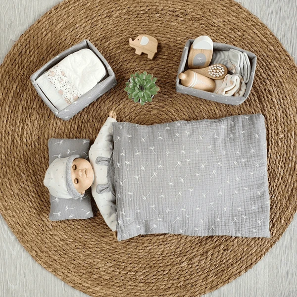 - Twee opvouwbare stoffen doosjes (ca. 10x15cm) gemaakt van grijze mousseline stof met mooie paardenbloemen print