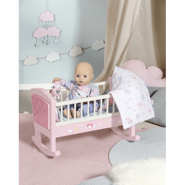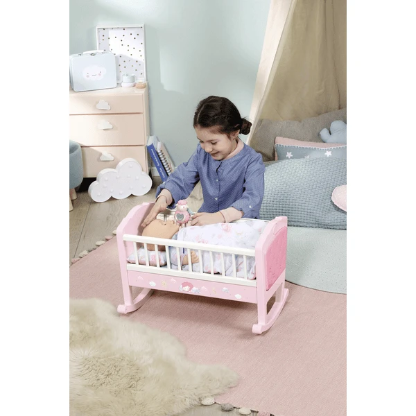 De wieg in roze met witte staven is voorzien van een matras en gezellig beddengoed. Baby Annabell poppen in elke maat voelen zich hier echt op hun gemak. Het schaapje bij het rooster waakt over haar slaap. “Welterusten en zoete dromen!”