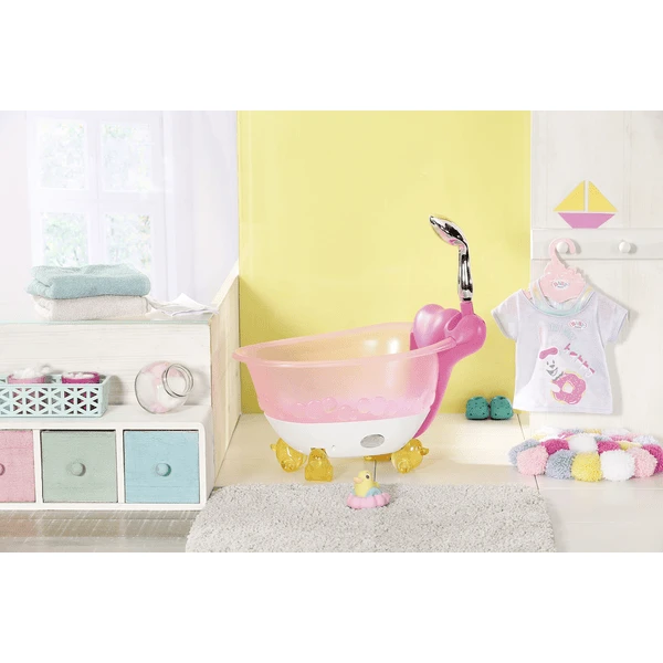 Er stroomt echt water uit de automatische douche. De slang kan nog een beetje uitgetrokken worden. Zo kan BABY born ontspannen op het hartkussen in het warme water liggen en zich laten afdouchen.